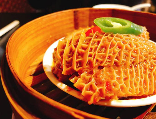 4. 蒸煮:将切割好的牛肚放入蒸锅中,加热蒸煮。蒸煮时间根据牛肚块状的大小和厚度而定,通常需要30分钟至1个小时,直到牛肚变得嫩熟。